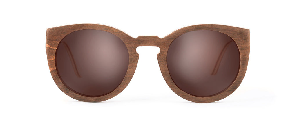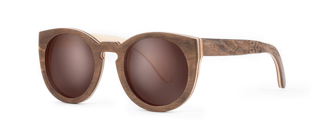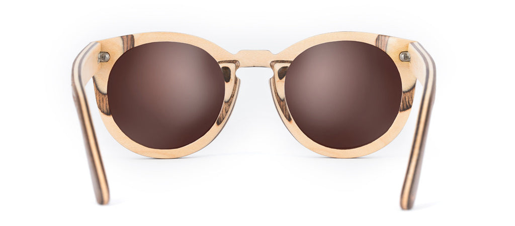 Our Carve features a classic round frame and raised eyelet bridge for a look which is elegantly timeless. These stylish wooden sunglasses are handcrafted from durable 7 ply Canadian maple skateboard laminate. With their stunning layering of natural and brown stained timber and polarised lenses, the arms of the Carve feature beautifully detailed etching to create an effortlessly chic and unique effect